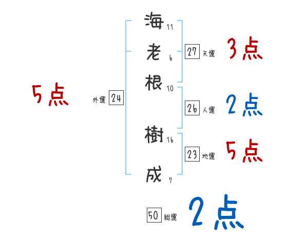 総運![]() | 海老根樹成さんの総運は50画の2つ星!浮き沈みが激しく不安定。しりすぼみに衰退しやすいので注意しましょう。 あなたの人生を表す1番重要な運勢です。生涯を通じて影響する総合運となり、主に50歳以降の晩年期に影響を及ぼします。 |