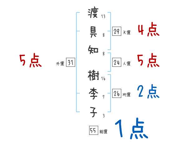 渡具知樹李子さんの画数の鑑定結果
