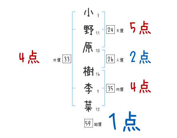 天運![]() | 小野原樹李菜さんの天運は24画の5つ星!家庭運が良く順調な人生。金運にも恵まれる。 家系が持つ宿命的な運勢を表します。祖先から受け継いだ苗字ですので自分の力が及びません。家柄を象徴します。 |