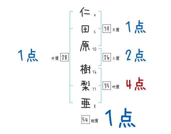 外運![]() | 仁田原樹梨亜さんの外運は28画の1つ星!家庭環境に注意。スポーツで活躍できる能力があるかも。 生活面を象徴する運勢です。外部から受ける影響力を表し、結婚運、家庭運や職場、環境への順応性を表します。 |
