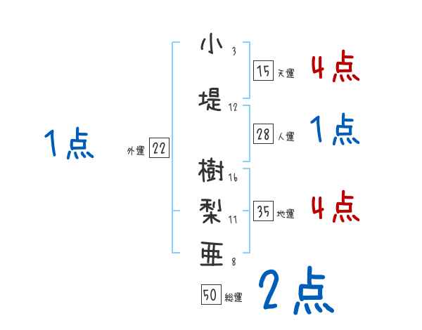 外運![]() | 小堤樹梨亜さんの外運は22画の1つ星!努力することが苦手ないっぽう手先が器用。芸術性にも優れる。 生活面を象徴する運勢です。外部から受ける影響力を表し、結婚運、家庭運や職場、環境への順応性を表します。 |