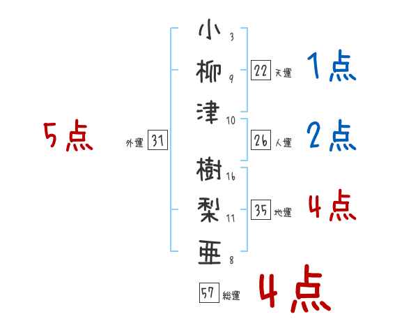 外運![]() | 小柳津樹梨亜さんの外運は31画の5つ星!社交性があり判断力に優れる。順風満帆な人生で円満な生活。 生活面を象徴する運勢です。外部から受ける影響力を表し、結婚運、家庭運や職場、環境への順応性を表します。 |