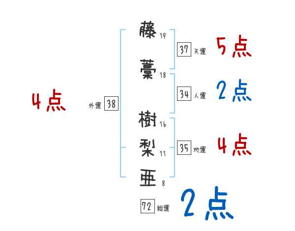 総運![]() | 藤藁樹梨亜さんの総運は72画の2つ星!災難が多く不安定な生活にならないように注意。明暗のある人生かも。 あなたの人生を表す1番重要な運勢です。生涯を通じて影響する総合運となり、主に50歳以降の晩年期に影響を及ぼします。 |