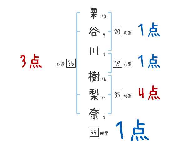 外運![]() | 栗谷川樹梨奈さんの外運は36画の3つ星!先見性が豊かです。多少神経質で苦労することも。 生活面を象徴する運勢です。外部から受ける影響力を表し、結婚運、家庭運や職場、環境への順応性を表します。 |