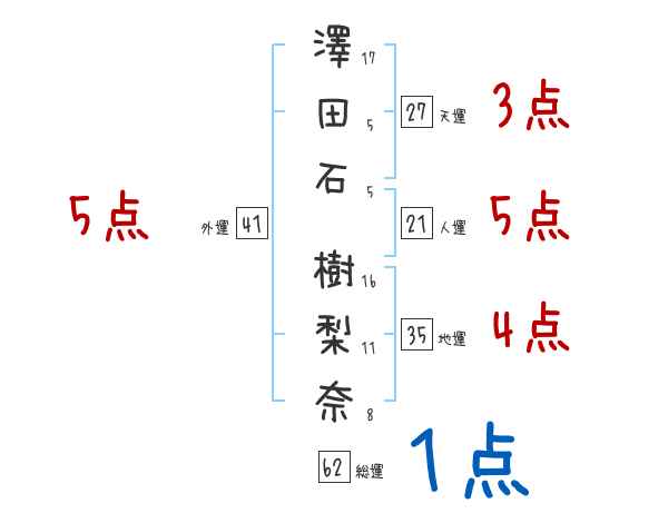天運![]() | 澤田石樹梨奈さんの天運は27画の3つ星!頭脳明晰だが強情で摩擦が多い傾向。孤立に注意。 家系が持つ宿命的な運勢を表します。祖先から受け継いだ苗字ですので自分の力が及びません。家柄を象徴します。 |