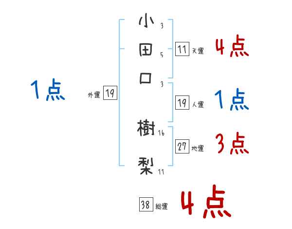 外運![]() | 小田口樹梨さんの外運は19画の1つ星!優れた才能を持ちますが、協調性が足りないことも。周りの人と協力する事を意識しましょう。 生活面を象徴する運勢です。外部から受ける影響力を表し、結婚運、家庭運や職場、環境への順応性を表します。 |