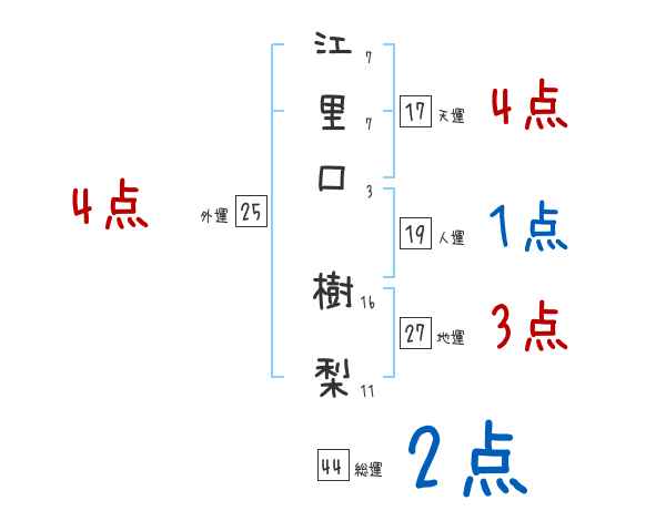 総運![]() | 江里口樹梨さんの総運は44画の2つ星!誠実で慎重な性格。物事を考えすぎないように注意しましょう。 あなたの人生を表す1番重要な運勢です。生涯を通じて影響する総合運となり、主に50歳以降の晩年期に影響を及ぼします。 |
