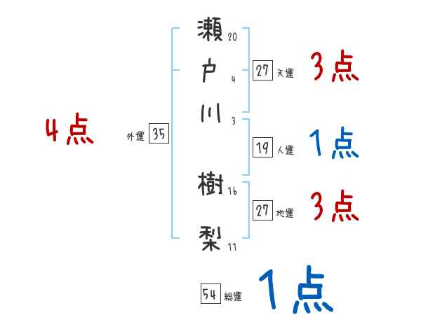 外運![]() | 瀬戸川樹梨さんの外運は35画の4つ星!温厚な性格で感受性が高い。穏和な性格で人望が厚い。 生活面を象徴する運勢です。外部から受ける影響力を表し、結婚運、家庭運や職場、環境への順応性を表します。 |