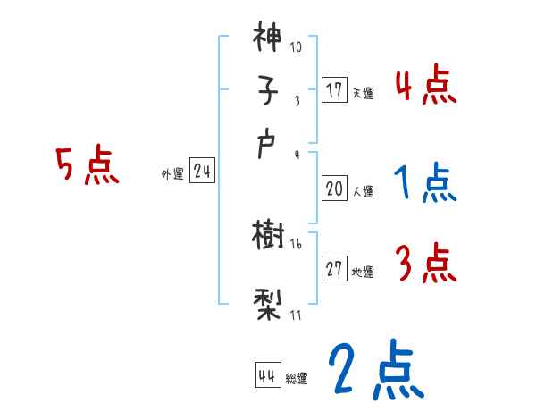外運![]() | 神子戸樹梨さんの外運は24画の5つ星!家庭運が良く順調な人生。金運にも恵まれる。 生活面を象徴する運勢です。外部から受ける影響力を表し、結婚運、家庭運や職場、環境への順応性を表します。 |
