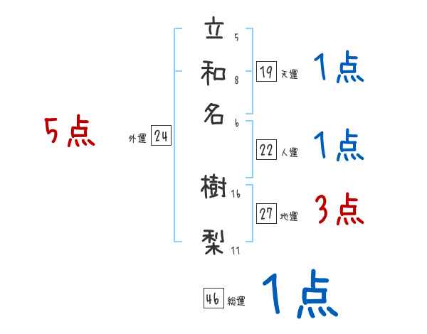 外運![]() | 立和名樹梨さんの外運は24画の5つ星!家庭運が良く順調な人生。金運にも恵まれる。 生活面を象徴する運勢です。外部から受ける影響力を表し、結婚運、家庭運や職場、環境への順応性を表します。 |