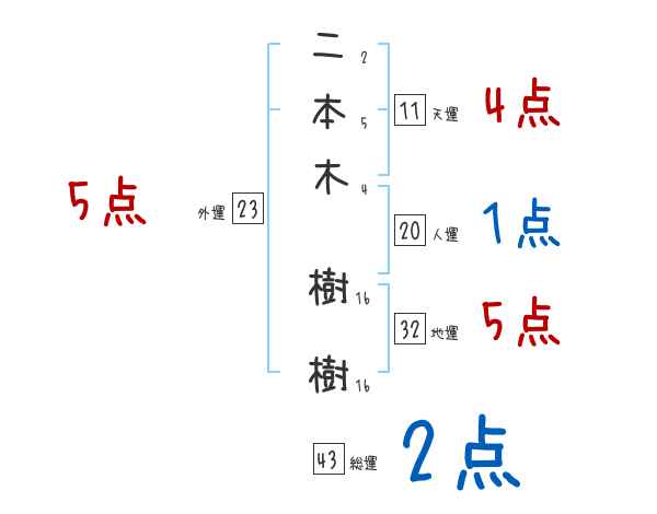 地運![]() | 二本木樹樹さんの地運は32画の5つ星!柔軟性があり成功する。チャンスが多く金運が良い。 個性を表す基礎的な運勢です。性格形成や対人関係、行動力など家庭環境に影響されます。主に誕生してから20歳くらいまでの若年期の運勢を表します。 |