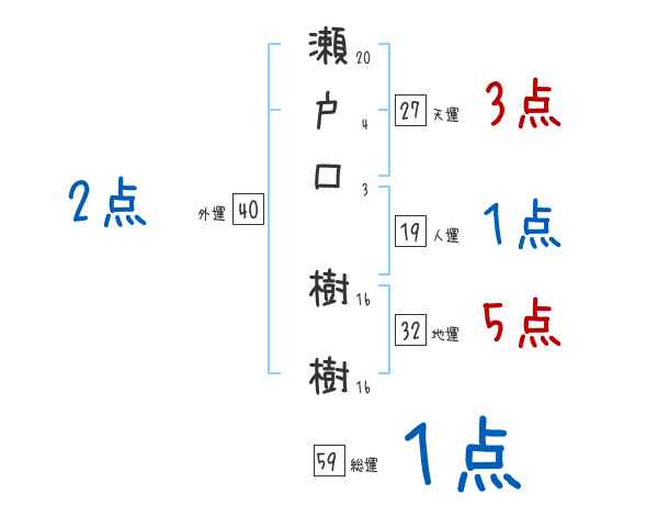 地運![]() | 瀬戸口樹樹さんの地運は32画の5つ星!柔軟性があり成功する。チャンスが多く金運が良い。 個性を表す基礎的な運勢です。性格形成や対人関係、行動力など家庭環境に影響されます。主に誕生してから20歳くらいまでの若年期の運勢を表します。 |