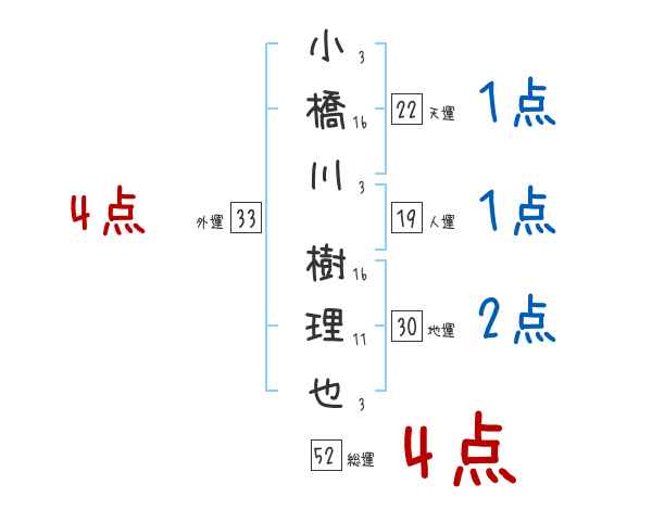 外運![]() | 小橋川樹理也さんの外運は33画の4つ星!権力志向でプライドが高い。勇気があり運を切り開き成功する。 生活面を象徴する運勢です。外部から受ける影響力を表し、結婚運、家庭運や職場、環境への順応性を表します。 |
