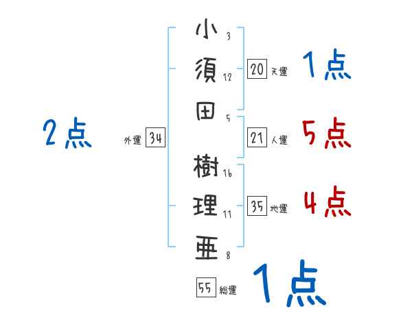 外運![]() | 小須田樹理亜さんの外運は34画の2つ星!独創性に優れるが、自尊心が強く災難に注意しましょう。 生活面を象徴する運勢です。外部から受ける影響力を表し、結婚運、家庭運や職場、環境への順応性を表します。 |