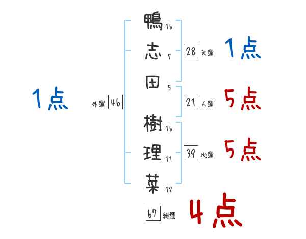 天運![]() | 鴨志田樹理菜さんの天運は28画の1つ星!家庭環境に注意。スポーツで活躍できる能力があるかも。 家系が持つ宿命的な運勢を表します。祖先から受け継いだ苗字ですので自分の力が及びません。家柄を象徴します。 |