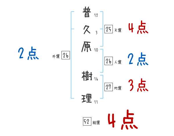 外運![]() | 普久原樹理さんの外運は26画の2つ星!波瀾万丈かも。信頼できる人を大事にしましょう。 生活面を象徴する運勢です。外部から受ける影響力を表し、結婚運、家庭運や職場、環境への順応性を表します。 |