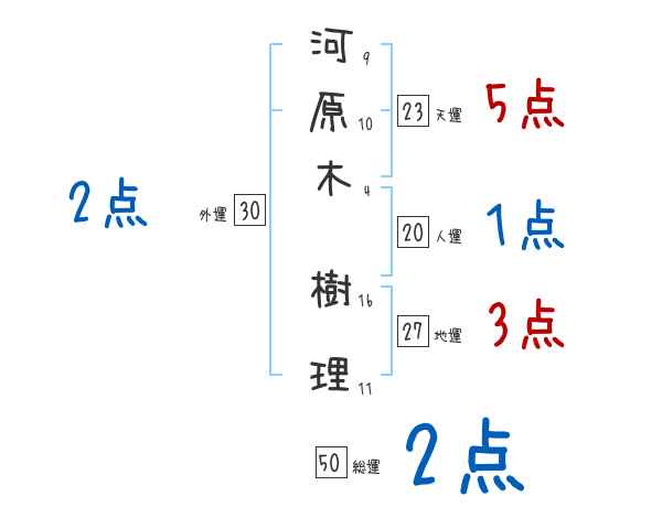 総運![]() | 河原木樹理さんの総運は50画の2つ星!浮き沈みが激しく不安定。しりすぼみに衰退しやすいので注意しましょう。 あなたの人生を表す1番重要な運勢です。生涯を通じて影響する総合運となり、主に50歳以降の晩年期に影響を及ぼします。 |