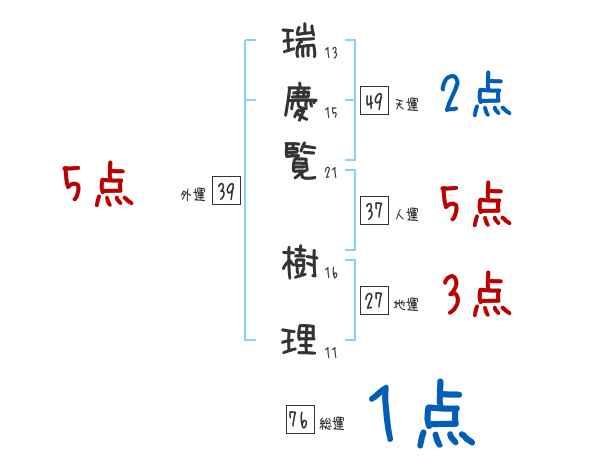 天運![]() | 瑞慶覧樹理さんの天運は49画の2つ星!不安定な性格で明暗がある人生。周りの人には支援されやすい。 家系が持つ宿命的な運勢を表します。祖先から受け継いだ苗字ですので自分の力が及びません。家柄を象徴します。 |