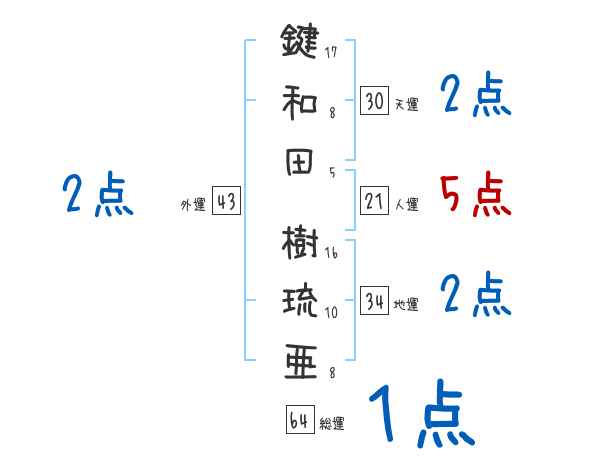 総運![]() | 鍵和田樹琉亜さんの総運は64画の1つ星!災難が多く精神的なもろさに注意。トラブルに巻き込まれないように気をつけて。 あなたの人生を表す1番重要な運勢です。生涯を通じて影響する総合運となり、主に50歳以降の晩年期に影響を及ぼします。 |