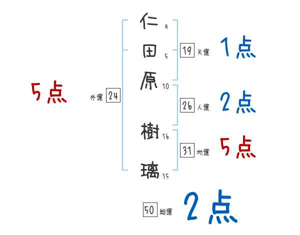外運![]() | 仁田原樹璃さんの外運は24画の5つ星!家庭運が良く順調な人生。金運にも恵まれる。 生活面を象徴する運勢です。外部から受ける影響力を表し、結婚運、家庭運や職場、環境への順応性を表します。 |