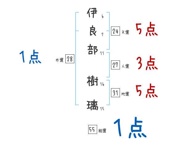 天運![]() | 伊良部樹璃さんの天運は24画の5つ星!家庭運が良く順調な人生。金運にも恵まれる。 家系が持つ宿命的な運勢を表します。祖先から受け継いだ苗字ですので自分の力が及びません。家柄を象徴します。 |