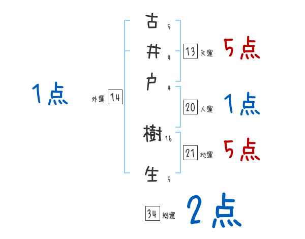 天運![]() | 古井戸樹生さんの天運は13画の5つ星!才能に恵まれ人気がある。名声を手に入れる。円満な人生。 家系が持つ宿命的な運勢を表します。祖先から受け継いだ苗字ですので自分の力が及びません。家柄を象徴します。 |