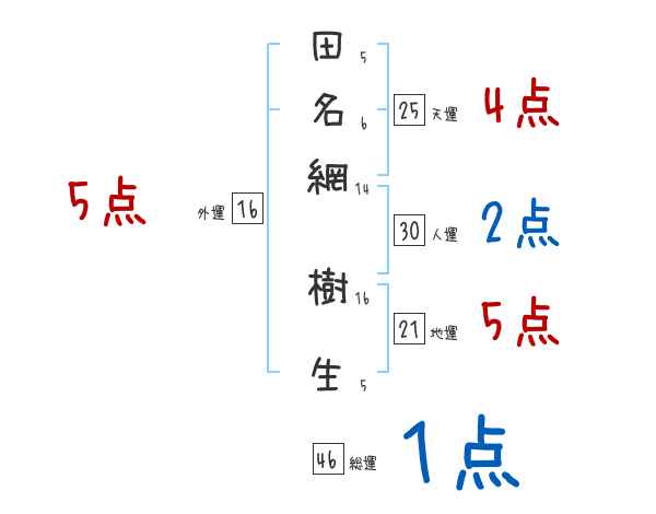 天運![]() | 田名網樹生さんの天運は25画の4つ星!個性があり才能があふれる。強運の持ち主で発展する。 家系が持つ宿命的な運勢を表します。祖先から受け継いだ苗字ですので自分の力が及びません。家柄を象徴します。 |