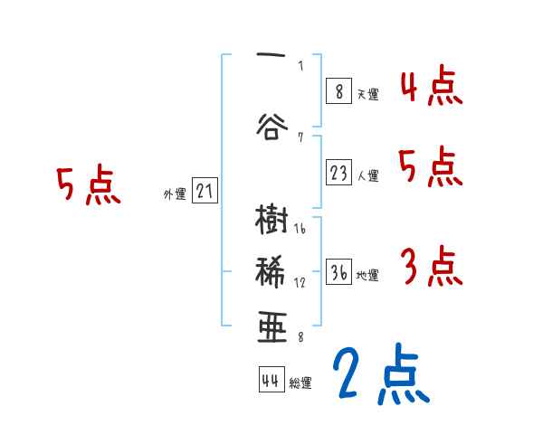 天運![]() | 一谷樹稀亜さんの天運は8画の4つ星!勤勉家。根気強く努力し成功する。忍耐力がある。 家系が持つ宿命的な運勢を表します。祖先から受け継いだ苗字ですので自分の力が及びません。家柄を象徴します。 |