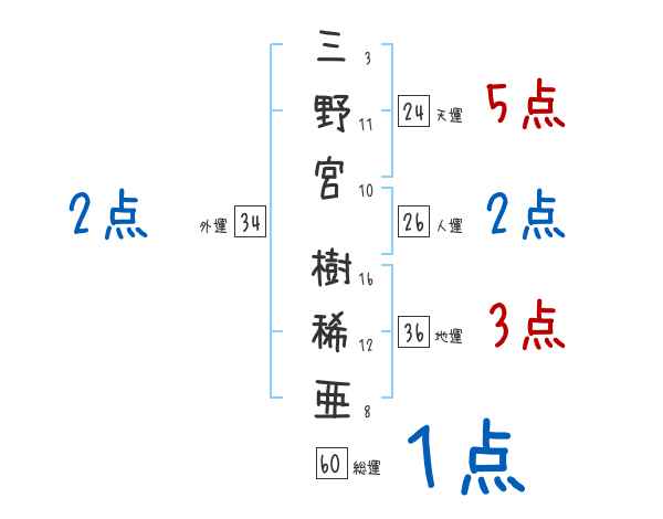 天運![]() | 三野宮樹稀亜さんの天運は24画の5つ星!家庭運が良く順調な人生。金運にも恵まれる。 家系が持つ宿命的な運勢を表します。祖先から受け継いだ苗字ですので自分の力が及びません。家柄を象徴します。 |