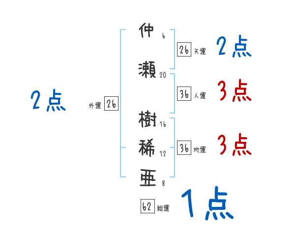 外運![]() | 仲瀬樹稀亜さんの外運は26画の2つ星!波瀾万丈かも。信頼できる人を大事にしましょう。 生活面を象徴する運勢です。外部から受ける影響力を表し、結婚運、家庭運や職場、環境への順応性を表します。 |