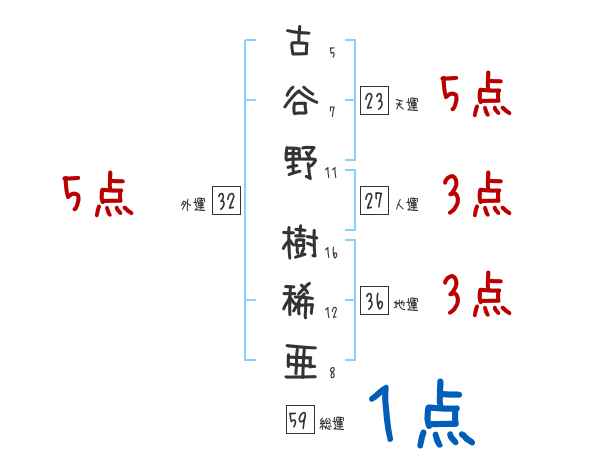 天運![]() | 古谷野樹稀亜さんの天運は23画の5つ星!想像力に優れ活力がある。一代で成功し名誉を手に入れる。 家系が持つ宿命的な運勢を表します。祖先から受け継いだ苗字ですので自分の力が及びません。家柄を象徴します。 |