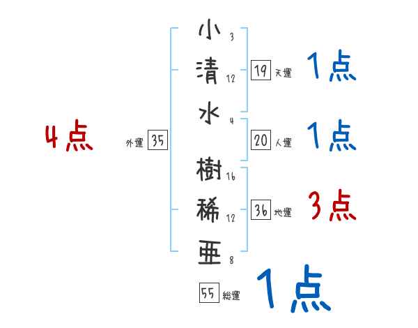 外運![]() | 小清水樹稀亜さんの外運は35画の4つ星!温厚な性格で感受性が高い。穏和な性格で人望が厚い。 生活面を象徴する運勢です。外部から受ける影響力を表し、結婚運、家庭運や職場、環境への順応性を表します。 |