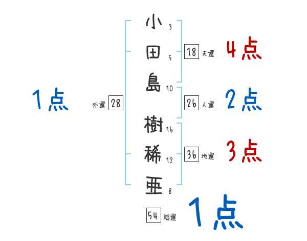 総運![]() | 小田島樹稀亜さんの総運は54画の1つ星!トラブルが多いかも。周りをよく見て協調して過ごしましょう。 あなたの人生を表す1番重要な運勢です。生涯を通じて影響する総合運となり、主に50歳以降の晩年期に影響を及ぼします。 |