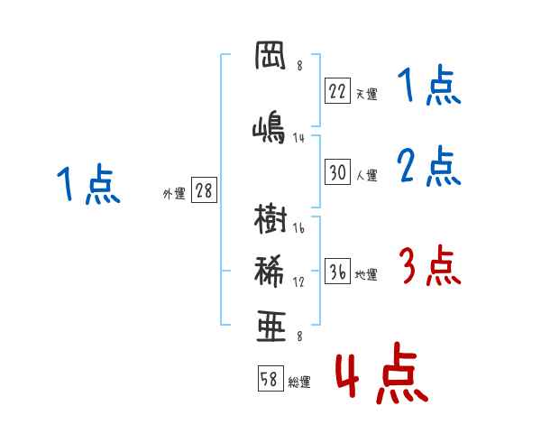 | 外運  | 岡嶋樹稀亜さんの外運は28画の1つ星!家庭環境に注意。スポーツで活躍できる能力があるかも。生活面を象徴する運勢です。外部から受ける影響力を表し、結婚運、家庭運や職場、環境への順応性を表します。 |