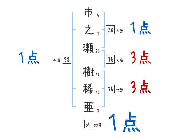 天運![]() | 市之瀬樹稀亜さんの天運は28画の1つ星!家庭環境に注意。スポーツで活躍できる能力があるかも。 家系が持つ宿命的な運勢を表します。祖先から受け継いだ苗字ですので自分の力が及びません。家柄を象徴します。 |