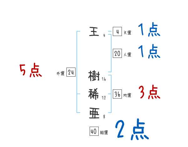 外運![]() | 王樹稀亜さんの外運は24画の5つ星!家庭運が良く順調な人生。金運にも恵まれる。 生活面を象徴する運勢です。外部から受ける影響力を表し、結婚運、家庭運や職場、環境への順応性を表します。 |