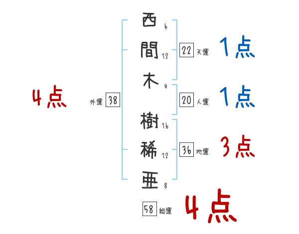 外運![]() | 西間木樹稀亜さんの外運は38画の4つ星!温厚な性格で技術的な才能を発揮する。職人的な仕事に向いている。 生活面を象徴する運勢です。外部から受ける影響力を表し、結婚運、家庭運や職場、環境への順応性を表します。 |