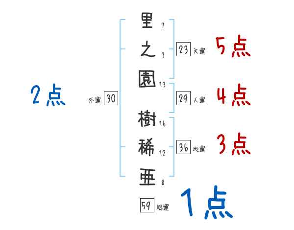 天運![]() | 里之園樹稀亜さんの天運は23画の5つ星!想像力に優れ活力がある。一代で成功し名誉を手に入れる。 家系が持つ宿命的な運勢を表します。祖先から受け継いだ苗字ですので自分の力が及びません。家柄を象徴します。 |