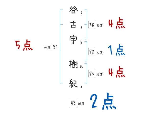 外運![]() | 谷古宇樹紀さんの外運は21画の5つ星!統率力がある。独立し成功する。名誉を手に入れる。 生活面を象徴する運勢です。外部から受ける影響力を表し、結婚運、家庭運や職場、環境への順応性を表します。 |