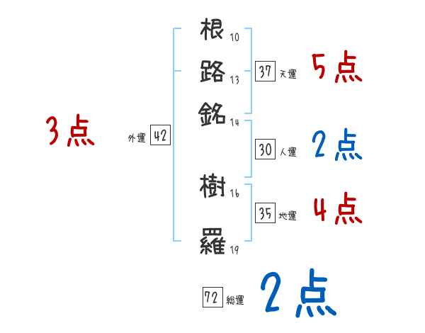 総運![]() | 根路銘樹羅さんの総運は72画の2つ星!災難が多く不安定な生活にならないように注意。明暗のある人生かも。 あなたの人生を表す1番重要な運勢です。生涯を通じて影響する総合運となり、主に50歳以降の晩年期に影響を及ぼします。 |