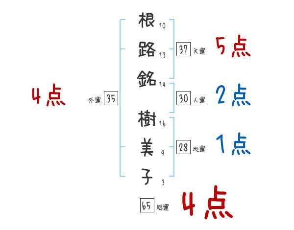 外運![]() | 根路銘樹美子さんの外運は35画の4つ星!温厚な性格で感受性が高い。穏和な性格で人望が厚い。 生活面を象徴する運勢です。外部から受ける影響力を表し、結婚運、家庭運や職場、環境への順応性を表します。 |