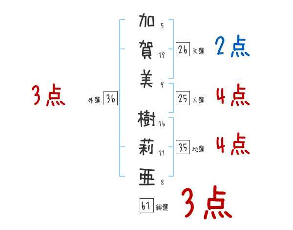 天運![]() | 加賀美樹莉亜さんの天運は26画の2つ星!波瀾万丈かも。信頼できる人を大事にしましょう。 家系が持つ宿命的な運勢を表します。祖先から受け継いだ苗字ですので自分の力が及びません。家柄を象徴します。 |