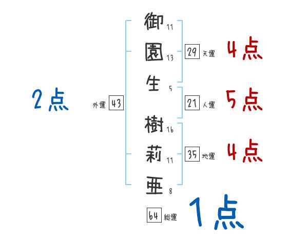 人運![]() | 御園生樹莉亜さんの人運は21画の5つ星!統率力がある。独立し成功する。名誉を手に入れる。 性格や才能などを表す2番目に重要な運勢です。人間関係や協調性、社会的な成功に影響します。主に20歳から50歳ぐらいまでの中年期の運勢を表します。 |