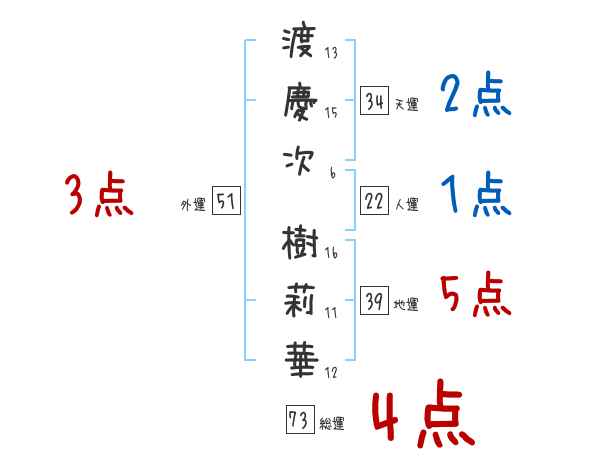地運![]() | 渡慶次樹莉華さんの地運は39画の5つ星!社交性に優れ人望が厚い。人の上に立ち成功する。 個性を表す基礎的な運勢です。性格形成や対人関係、行動力など家庭環境に影響されます。主に誕生してから20歳くらいまでの若年期の運勢を表します。 |