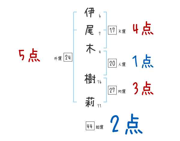 外運![]() | 伊尾木樹莉さんの外運は24画の5つ星!家庭運が良く順調な人生。金運にも恵まれる。 生活面を象徴する運勢です。外部から受ける影響力を表し、結婚運、家庭運や職場、環境への順応性を表します。 |