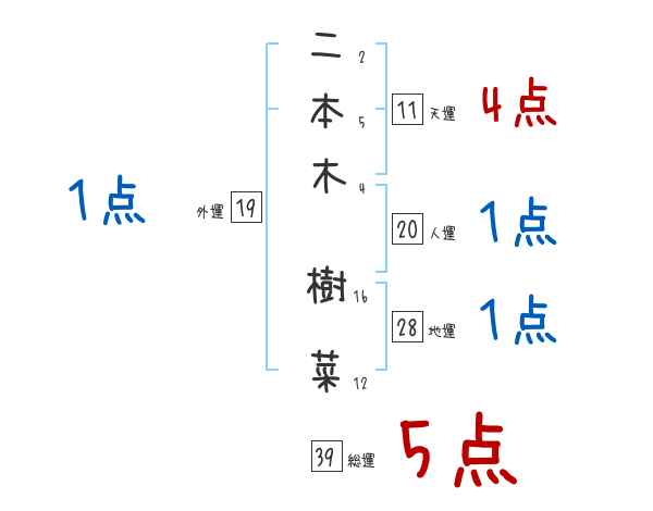 総運![]() | 二本木樹菜さんの総運は39画の5つ星!社交性に優れ人望が厚い。人の上に立ち成功する。 あなたの人生を表す1番重要な運勢です。生涯を通じて影響する総合運となり、主に50歳以降の晩年期に影響を及ぼします。 |