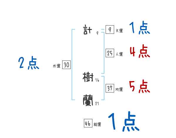 天運![]() | 計樹蘭さんの天運は9画の1つ星!消極的で才能を発揮することが苦手なことも。周りの意見に耳を傾けましょう。 家系が持つ宿命的な運勢を表します。祖先から受け継いだ苗字ですので自分の力が及びません。家柄を象徴します。 |