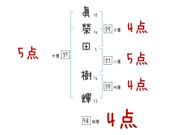 外運![]() | 眞榮田樹輝さんの外運は37画の5つ星!努力家で順応性に優れる。現実的な考え方ができ忠実に物事をこなす。 生活面を象徴する運勢です。外部から受ける影響力を表し、結婚運、家庭運や職場、環境への順応性を表します。 |