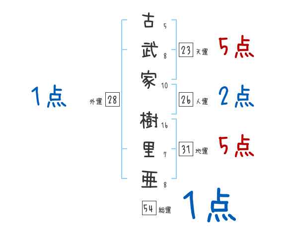 天運![]() | 古武家樹里亜さんの天運は23画の5つ星!想像力に優れ活力がある。一代で成功し名誉を手に入れる。 家系が持つ宿命的な運勢を表します。祖先から受け継いだ苗字ですので自分の力が及びません。家柄を象徴します。 |