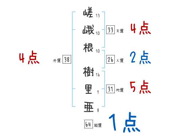 天運![]() | 嵯峨根樹里亜さんの天運は33画の4つ星!権力志向でプライドが高い。勇気があり運を切り開き成功する。 家系が持つ宿命的な運勢を表します。祖先から受け継いだ苗字ですので自分の力が及びません。家柄を象徴します。 |
